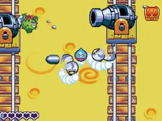 Another primary game mechanic is the tank battles. Tank battles either occur in the stages or at the tank battle arena in Boingburg. In stages, when the player encounters a platform with an enemy on it standing in front of a slime-shaped tank, they may summon their tank to do battle with them.[4] When the player goes into the battle, the top screen displays a zoomed out view of the two tanks on either side of the screen, and the bottom screen displays the standard gameplay.[4] Each tank has two cannons that ammunition may be loaded into, and an HP meter, the latter which varies from tank to tank.[4] Ammunition comes from varying points in the tank; the location of these drop points varies depending on which tank is being used.[4] The player picks up ammunition using the Elasto Blast, like they pick up items in the other mode of play. They then may throw the ammunition into one or both of the cannons, causing the ammunition to be fired at the opposing tank. The opponent, however, will also fire ammunition at the player's tank. If two pieces of ammunition collide with each other, both pieces will fall to the ground, though some pieces of ammunition have more defensive and/or offensive power than others.[4]