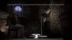 Although the game features a linear plot with a set outcome,[11] the players have to make many choices throughout the game that have far-reaching impact on the later story events (but not the ending). An optional, online-only "social" feature allows players to discover (either before, or after making the choice) which options other players (and their Facebook friends in particular[12]) picked in these situations.[13] These statistics are stored in a shared global database for all platforms.[12] The game additionally displays a special "The balance has shifted" icon to warn players before plot-relevant choices, even when playing offline.[9] An in-game journal, akin to April Ryan's diary in TLJ, keeps track of the recent plot developments.[4]