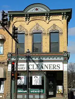 Most of the properties in the district are within the bounds of West Dundee. The Dundee Cemetery first saw use in 1841, though it did not officially become a cemetery until 1862. A Baptist church was built in 1865 on the corner of Fourth and Main Streets, which later was sold to the Methodist congregation. Union School was originally built by Richter & Morris in 1873, but was destroyed in a fire five years later. It was reconstructed that year in the same design, and is now used by School District #300. Several important commercial properties were established along Main Street starting in the 1870s, including the First National Bank, Dundee State Bank, the Cleveland Drug Store, and the Dundee House Hotel. The First Congregational Church was also built on this strip in 1902, as did the Bethlehem Lutheran Church in 1912. St. James Episcopal Church was built in 1904 to serve the local Episcopalian congregation. In 1909, West Dundee constructed its Village Hall based on plans by George F. Morris of Elgin. St. Catherine's Catholic Church and School (1914, school added 1926) was an important church for Italian immigrants wishing to practice their faith while working for the Illinois Iron and Bolt Company.[1]