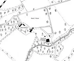 Pont states that the ancient strong Dunlop Castle situated by the Clerkland Burn (NS 42737 49312) was protected by a moat or fosse of water and had “goodly” orchards. Smith[24] records that the 'Airn Yett' of the old castle was still preserved and its details published (see Wikimedia). It was also called Hunt Hall because the Dunlops were huntsmen to the De Ross family (Paterson 1866). The whole estate was sometimes referred to as Hunt Hall. This castle was situated at the site of the present day Dunlop House.