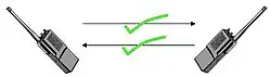 In a half-duplex or semiduplex system, both parties can communicate with each other, but not simultaneously; the communication is one direction at a time. An example of a half-duplex device is a walkie-talkie, a two-way radio that has a push-to-talk button. When the local user wants to speak to the remote person, they push this button, which turns on the transmitter and turns off the receiver, preventing them from hearing the remote person while talking. To listen to the remote person, they release the button, which turns on the receiver and turns off the transmitter. This terminology is not completely standardized, and some sources define this mode as simplex.[1][2]
