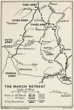 This was the meeting attended by the British generals. The Abbeville Meeting was arranged by General Henry Wilson and took place in the afternoon of March 25, 1918 (A second conference, relating to a Supreme War Council meeting, took place on 1-2 May 1918).[24] General Haig had informed his superior, General Henry Wilson, of the initial British defeat (at about 7 P.M., the previous night, over the telephone) and had asked him to come over from England.[25][26][27] Haig also invited the French military leadership to a meeting in Abbeville (30 miles south of B.E.F. Headquarters), which was to start at 3pm.[28] When General Wilson arrived from London that morning, he met with General Haig at his headquarters in Montreuil (GHQ) at 11am.[29][30][31] He was told that the British were confronted by the whole offensive weight of the German army.[32] General Haig handed Wilson an order, which his headquarters had prepared, that authorized an immediate withdrawal of B.E.F. forces from the trenches in the direction of the Channel ports of Calais, Dunkirk and Boulogne. The order also requested at least 20 divisions from General Petain, to cover the British retreat. Haig said, "Unless the whole French army came up we were beaten" and "It would be better to make peace on any terms we could."[33] General Wilson and General Haig drove to Abbeville early that afternoon.[34][35] At 4pm they were met by General Maxime Weygand and his aide.[36] Weygand was read the order, and understanding its significance, he asked for a handwritten copy. Although the plan meant abandoning the Western Front line as a defense and leaving a breach open to the Germans, it was the best the Allies could do under the circumstances without avoiding the wider catastrophe of encirclement and surrender. Weygand left the meeting with the order, and that evening hand delivered it to General Mordacq, Prime Minister Clemenceau's military aide.[37] The entire matter was settled the next day, at the Doullens Conference, when all sides finally got together.[38][39][40]