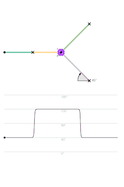 An extension to this approach is to use a quarter-circle arc produced by an oscillating link. A dyad with a prismatic joint can then be positioned such that the output link oscillates 90 degrees opposite of the oscillating link. This allows the design to be tile-able, with dyads to be appended onto each-other, and allow for double-dwells of any desirable occupied duration of the input stroke.