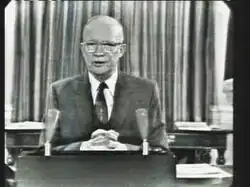 Eisenhower's farewell address (sometimes referred to as "Eisenhower's farewell address to the nation"[1]) was the final public speech of Dwight D. Eisenhower as the 34th president of the United States, delivered in a television broadcast on January 17, 1961. Perhaps best known for advocating that the nation guard against the potential influence of the military–industrial complex, a term he is credited with coining, the speech also expressed concerns about planning for the future and the dangers of massive spending, especially deficit spending, the prospect of the domination of science through federal funding and, conversely, the domination of science-based public policy by what he called a "scientific-technological elite".[2] Eisenhower played a significant role in the creation of this "elite" and its position of power, and thus there is an element of irony in his warning against it.[3] This speech and Eisenhower's Chance for Peace speech have been called the "bookends" of his administration.[4]