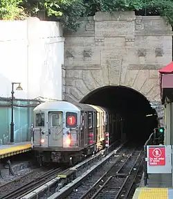 In April 1988,[25] the New York City Transit Authority (NYCTA) unveiled plans to speed up service on the Broadway–Seventh Avenue Line through the implementation of a skip-stop service: the 9 train.[26] When skip-stop service began on August 21, 1989, skip-stop service was implemented during rush hours and middays. Dyckman Street was served by the 1 at all times.[27][28][29] On September 4, 1994, midday skip-stop service was discontinued.[30] Skip-stop service ended on May 27, 2005, as a result of a decrease in the number of riders who benefited.[31]