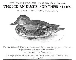 During his spare time he studied and collected the birds of India. His books included The Indian Ducks and their Allies (1908), Game Birds of India and Ceylon (1921), The Fauna of British India, Including Ceylon and Burma. Birds. (1922; eight volumes), Mishmi Man-eater (1928), The Nidification of the Birds of the Indian Empire (1932), and Cuckoo Problems (1942; the cuckoo was his chief interest within ornithology). He made a comprehensive collection of nearly 50,000 Indian birds' eggs, part of which he donated to the Natural History Museum, where he spent a lot of time working on the egg collections from India and Thailand. His eight-volume contribution to The Fauna of British India, Including Ceylon and Burma series became the standard reference work on the subject.[2] Part of the collection, about 152 specimens were sold to the private museum of the Tzar Ferdinand I of Bulgaria.[3] He also served on government advisory committees on the protection of birds and was from 1913 to 1936 honorary secretary and treasurer of the British Ornithologists' Union.