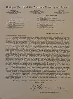 Warriner was founder and President of the Michigan Branch of the American School Peace League on October 28, 1910. He conducted the meeting at the 99th semi-annual Teachers Association of Gratiot County.[8] As such, he urged public school teachers in Michigan to educate its young people about the "new world order" and international organization aimed at peace that were ushered in by the early Hague Peace Conferences (of 1899 and 1907). Warriner spoke publicly on peace prior to the U.S. entry into the Great War[9][10][11] and was engaged in a public debate with Governor Chase Osborn about the propriety of introducing rifle shooting in schools, which the Governor endorsed.[12]