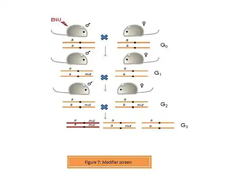 A modifier such as an enhancer or suppressor can alter the function of a gene. In a modifier screen, an organism with a pre-existing phenotype is selected. Thus, any mutations caused by the mutagen (ENU) can be assessed for their enhancive or suppressive activity.[8] Screening for dominant and recessive mutations is performed in a way similar to the conventional genome-wide screen (Figure 7). A number of modifier screens have been performed on Drosophila. Recently, Aliga et al. performed a dominant modifier screen using ENU-induced mice to identify modifiers of the Notch signaling pathway.[9] Delta 1 is a ligand for the Notch receptor. A homozygous loss-of-function of Delta 1 (Dll1lacZ/lacZ) is embryonically lethal. ENU-treated mice were crossed to Dll1lacZ heterozygotes. 35 mutant lines were generated in G1 of which 7 revealed modifiers of the Notch signaling pathway.