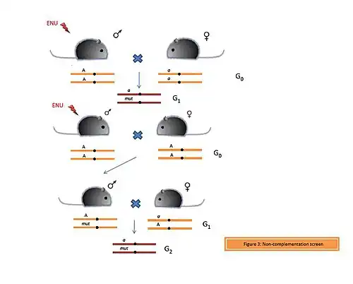 The phenomenon of redundancy explains that often multiple genes are able to compensate for the loss of a particular gene. However, if two or more genes involved in the same biological processes or pathways are lost, then this leads to non-allelic non-complementation. In a non-complementation screen, an ENU-induced male is crossed with a female carrying a mutant allele (a) of the gene of interest (A). If the mutation is dominant, then it will be present in every generation. However, if the mutation is recessive or if the G1 progeny are non-viable, then a different strategy is used to identify the mutation. An ENU-treated male is crossed with a wild type female. From the pool of G1 individuals, a heterozygous male is crossed to a female carrying the mutant allele (a). If the G2 progeny are infertile or non-viable, they can be recovered again from the G1 male.