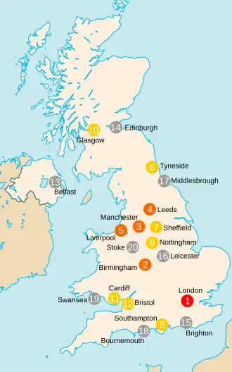 | 12 | Bristol (1,041,000) | Bristol (568,000) • Weston-super-Mare (70,000) • Bath (65,000) • Clevedon (25,000) |