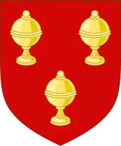 Augmentation arms of Butler, Earl & Marquess of Ormonde: Gules, three covered cups or. The Earls of Ormond, quartered this arms with the arms of their ancestor Theobald Walter, 1st Baron Butler (died 1206) (Or, a chief indented azure) in the 1st quarter[1]