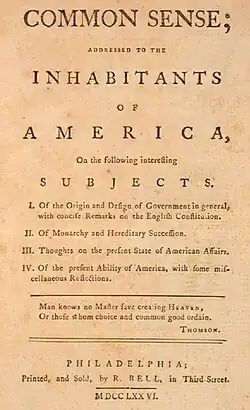 In the years prior to the Revolutionary War, Massachusetts played an influential role in supporting the Revolution. Boston was considered by royal authorities as a "hotbed of sedition".[156] During this time printers and publishers played a fundamental role in promoting the call for independence in the and uniting the American colonies in that end. Thomas Paine's 1776 work, Common Sense, outlined moral and political arguments and is considered "the most incendiary and popular pamphlet of the entire revolutionary era", and was printed by Robert Bell.[157] In response to Paine's work, James Chalmers, under the assumed name of Candidus[o] countered it with a pamphlet entitled The Plain Truth, also printed by Robert Bell, which was not received well by a patriotic populace who drove Chalmers into exile.[158]