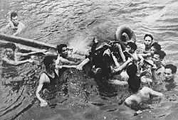 McCain's plane went into a vertical inverted spin.[127] McCain bailed out upside down at high speed;[128] the force of the ejection fractured his right arm in three places, his left arm, and his right leg at the knee, and knocked him unconscious.[128][129] McCain nearly drowned after parachuting into Trúc Bạch Lake in Hanoi; the weight of his equipment was pulling him down, and as he regained consciousness, he could not use his arms.[123] Eventually, he was able to inflate his life vest using his teeth.[123] Several Vietnamese, possibly led by Department of Industry clerk Mai Van On, pulled him ashore.[130] A mob gathered around, spat on him, kicked him, and stripped him of his clothes; his left shoulder was crushed with the butt of a rifle and he was bayoneted in his left foot and left groin area.[123][128][129] He was then transported to Hanoi's main Hỏa Lò Prison, nicknamed the "Hanoi Hilton" by American POWs.[131]
