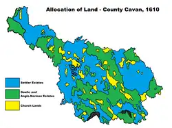 1. ^ Irish would have been spoken by the vast majority of the population and used as the day-to-day language of the kings and nobility as well; however, the O'Reilly kings and many Brefnian nobles were evidently able to write fluently in English as far back as the late 15th century. The implementation of English law in the 16th century probably expanded its use even further.