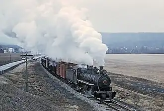 The EBT maintained an office in Philadelphia, PA. An 1893 timetable lists their executive offices at 320 Walnut St.,[7] then the main commercial area of the city. The city's business center migrated west and by 1939 the EBT's office was at 1421 Chestnut St.[8] EBT was generally profitable from the 1880s through the 1940s and was able to modernize its infrastructure far more than other narrow gauge railroads. The railroad's roundhouse, one of the oldest railroad roundhouses in the US still in operation, was built in 1882.[9] A coal cleaning plant and a full maintenance shops complex were also built, bridges were upgraded from iron and wood to steel and concrete, wood rolling stock was replaced by steel, and modern high-powered steam locomotives were bought from the Baldwin Locomotive Works of Philadelphia. In the post-WWII years most railroads converted to diesel motive power but the EBT considered this switch unnecessary. Steam locomotives had proven longevity and, as EBT was a coal carrier, fuel was abundant and cheap.[10]