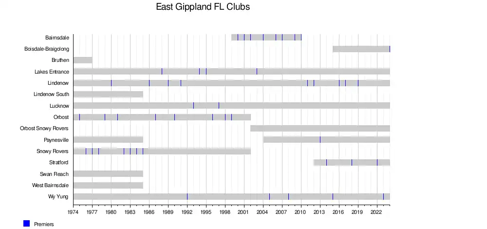 The East Gippsland FL in its present incarnation began in 1974 with the merger of the Gippsland Football League and the Bairnsdale District Football League. The league has had a number of clubs fold, merge, leave and return over its history, due partly to changing economic circumstances in the area, with areas such as Orbost losing large amounts of their population.