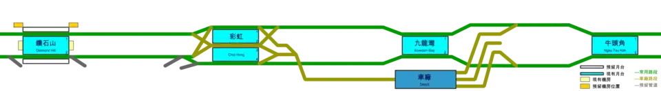 Track diagram, Diamond Hill to Ngau Tau Kok. Green: Kwun Tong line; Grey: reserved for East Kowloon line; Khaki: access tracks to Kowloon Bay Depot