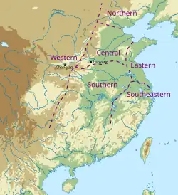 Several texts contain evidence of dialectal variation in the Eastern Han period. The Fangyan, from the start of the period, discusses variations in regional vocabulary. By analysing the text, Paul Serruys identified six dialect areas: a central area centred on the Central Plain east of Hangu Pass, surrounded by northern, eastern, southern and western areas, and a southeastern area to the south and east of the lower Yangtze.[16][17][18] Distinct rhyme systems of the Han period poets identified by Luo and Zhou broadly correspond to these dialect areas.[19]