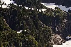 The mid-elevation forests in the North Cascades with an elevation between 2,000 and 4,300 feet (600 and 1,300 m) is the Silver Fir Ecoregion.[6] The Silver Fir Ecoregion makes up for much of the valleys in the Alpine Lakes area. The average annual temperature in this ecoregion is 42 °F (6 °C) and the average precipitation in centimeters is between 220 and 280 centimetres (87 and 110 in).[8] Typical montane forests in this ecoregion is dominated by Pacific silver fir and also contains noble fir, Douglas fir, and Alaska yellow-cedar.[6][8] Coarse woody debris is very characteristic of the Silver Fir Ecoregion, providing microsites for organisms. The Pacific silver fir zone is in some of the steepest parts of the topography and heavy snow often leads to avalanche gullies.[6] In every major drainage basin along the western slopes of the Cascade Mountains there is evidence of avalanche tracks breaking up the forested vegetation with nonforested vegetation.[6] These gullies provide sites of new successional growth as they move toward a coniferous forest again.[6] Because of the dense forests of the Silver Fir Ecoregion, it was the preferred area for commercial logging prior to designation of areas as wilderness.