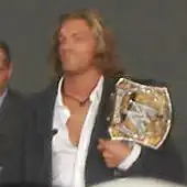Edge was drafted to the Raw brand in the 2004 WWE draft lottery on March 22, 2004, where he speared Eric Bischoff and returned to in-ring action shortly after the event.[69] At Backlash on April 18, Edge defeated Kane,[70] and on the April 19 episode of Raw, he and World Heavyweight Champion Chris Benoit won the World Tag Team Championship from Batista and Ric Flair.[71] They continued a close partnership even after losing the title; at Bad Blood on June 13, Edge and Benoit defeated La Résistance (who defeated them for the titles on the May 31 episode of Raw) in a match for the World Tag Team Championship by disqualification but did not win the titles. The team disbanded when Edge won the Intercontinental Championship at Vengeance on July 11 defeating Randy Orton, thus becoming a five time Intercontinental Champion.[72] At SummerSlam on August 15, Edge defeated Chris Jericho and Batista in a triple threat match to retain the Intercontinental Championship.[73] Following a legitimate groin injury in a non-televised match, Raw General Manager Eric Bischoff stripped Edge of the Intercontinental title on the September 6 episode of Raw.[74]