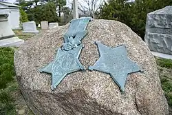 Rice retired on August 14, 1903, with the rank of brigadier general. He became a member of the Medal of Honor Legion, Military Order of the Loyal Legion, Grand Army of the Republic, Society of Prisoners of War, Sons of the Revolution, Sons of the American Revolution, Society of the Army of the Potomac, and the General Society of the War of 1812. General Rice served as Grand Marshal of Ceremonies at the Louisiana Purchase Exposition in 1904, and he spent the summer of 1905 with his daughter Corinne and her husband.[1][2] He died "very suddenly" of heart failure "while sitting in a hammock"[6] at Wakefield, Massachusetts, on July 20, 1906, lay in state in the Hall of Flags of the State House in Boston, and was buried in Section 3 of Arlington National Cemetery. His wife, Elizabeth H. Rice (1849–1919) is buried with him. His grave is marked by a large rock with a 3.5 foot bronze sculpture of the Medal of Honor draped over the boulder with the inscription, "The Congress to lieut.-Col. Edmund Rice, 19th Mass. Volunteers, for conspicuous bravery on the 3rd day of the battle of Gettysburg."[2]