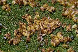 The reserve in the Andean has vegetation consisting of tropical alpine herbs with dwarf shrubs of the forests of Polylepis.[2] Plant and tree species are reportedly about 190 species, in the harsh terrain, which have emerged given the conditions of salinity, lack of fresh water, low temperatures, and scarcity of nutrients. Flora restricted to this and other ecoregions include the genera Barneoudia, Hexaptera, Nototriche, Pycnophyllum and Werneria. The vegetation is characterized by the strong presence of pasture grass (straw) such as Peruvian feather grass (Stipa ichu) in some plains and hillsides. The important plant species on which people are dependent for fuel wood in the area is yareta, which grows in the forest of the reserve at 1–3 mm (0.039–0.118 in) per year amidst rocky terrain. This hardwood tree, which looks like a foamy bubble bath but is as hard as stone, grows slowly, attaining a height of about 5 ft (1.5 m) in height with girth of 10 ft (3.0 m) and can be as old as 3000 years.[3][5] In places with higher humidity, Tola or Thola (Parastrephia lepidophylla), Quinoa and Kenua bush tree are found.[6] The villagers use vegetation as fuel for heating and cooking.