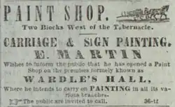 Shortly after arriving in Salt Lake City, Edward married Jane Gray on February 14, 1857.[5] He was a participant in Plural Marriage.[4] Edward sought employment in a wide variety of ways during his time in Salt Lake City. He advertised himself as a Carriage and Sign Painter in the Salt Lake City Newspaper, announcing the opening of his new paint shop on the premises formally known as Wardle's Hall, two blocks west of the Tabernacle, in January 1859.[1][13] He was still working as a painter and glazier in 1861.[9] He then married Eliza Salmon on October 3, 1863.[5] Edward had tough time making a living as a painter, and eventually made the switch over to photography and general store merchandising.[7]