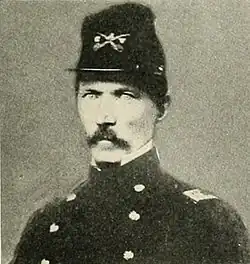 Edward McGarry was a native of New York, who served as a second lieutenant in the Mexican–American War with the 10th U.S. Infantry Regiment. He saw no action except as part of the garrison army before the peace took effect.[1] McGarry left the Army and traveled to California after the end of the war and became involved in California politics serving as an assemblyman from Napa County's 20th District from 1853 to 1854. Subsequently, from 1854 to 1855, he was a state senator from Napa, Solano and Yolo Counties.[2] When the American Civil War broke out, he assisted in raising the 2nd California Cavalry Regiment, serving first as a major under Col. Columbus Sims. After marching to Fort Ruby, in Nevada Territory, Sims was relieved of his command by the Department of the Pacific on August 19, 1862. He was replaced in command of the 2nd California Cavalry detachment by McGarry by Col. Patrick Edward Connor. Under Connor's command the 2nd Cavalry served in Nevada and Utah during the rest of the Civil War, fighting various native tribes.