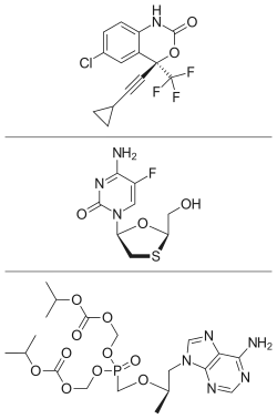 Efavirenz is a non-nucleoside reverse transcriptase inhibitor (NNRTI) of HIV-1. Emtricitabine is a nucleoside reverse transcriptase inhibitor (NRTI) of HIV-1. Tenofovir is a nucleotide reverse transcriptase inhibitor of HIV-1, and it can be classified as an NtRTI. These three drugs work in combination to target the HIV reverse transcriptase protein in three ways, which reduces the virus's capacity to mutate.[4]