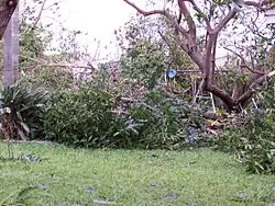 A man in the unincorporated community of Loxahatchee died after he was crushed by a tree that pushed him into the windshield of his vehicle.[99] The metal roof at Western Pines Middle School was peeled back, exposing multiple classrooms.[100] In nearby Royal Palm Beach, 331 homes were impacted.[91] Damage there reached about $9 million, including about $1.5 million to village property.[101] The village of Wellington suffered severe damage. The community center nearly lost its roof, the bleachers around the pool collapsed, and fences and canopies surrounding the tennis courts were destroyed. A few local parks experienced similar effects to their bleachers and sports facilities.[102] Palm Beach Central High School was severely damaged. Its kitchen and cafeteria lost portions of their roof, the theater and media center were flooded, the gym suffered a roof leak, and trees, signs, and fences were knocked down throughout campus.[103] Many trees and utility poles were snapped at The Mall at Wellington Green.[90] Approximately 3,955 homes were impacted and 4 others destroyed.[91] Overall, Wellington suffered almost $62 million in damage, with $50.4 million to property, and $3.8 million to public facilities, with repairs costs reaching almost $5.9 million.[104]