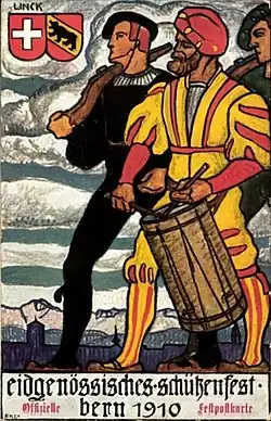 At the first modern Eidgenössisches Freischiessen in 1824, the federal shooting association, Schweizerischer Schützenverein was founded.[2] In the following years, the federal shooting festivals played an important role in the politics of the formative Swiss federal state. The first federal Schützenfest after the formation of the federal state, again held in Aarau, in 1849, figures prominently in Gottfried Kellers Das Fähnlein der sieben Aufrechten, where Keller portrays the shooting clubs as vital for the preservation of direct democracy in the young Swiss federal state.