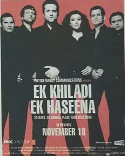 Ek Khiladi Ek Haseena (translation: One Player, One Beauty) is a 2005 Indian Hindi-language crime thriller film directed by Suparn Verma, according to whom it is inspired by 14 con films, including the American films Confidence and House of Games.[2][3] It stars Fardeen Khan, Feroz Khan, Kay Kay Menon and Koena Mitra.[4] The film was released on 18 November 2005, and was a commercial failure.[5]