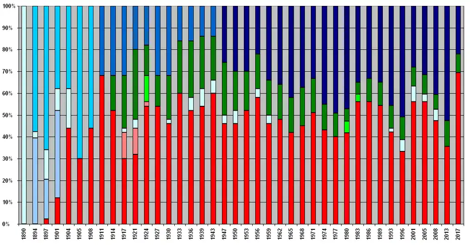 Until the 1904 election, most candidates did not belong to political parties. However, some candidates declared their support for the administration of the time, while others declared their opposition to it. Full details on any election are linked via the year of the election at the start of the row.