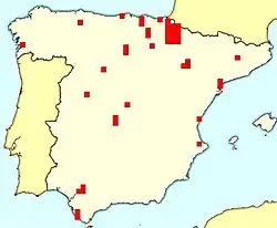 Carlism was not a genuinely nationwide grouping; its so-called Mass Party Index, a parameter devised to gauge capacity to compete in all electoral districts, ranged from meager 20% (1931) to 48% (1933) and 43% (1936).[70] Measured in terms of the number of mandates won, geographical support for Carlism during the Republican period remained uneven; some two thirds of seats were obtained in the Northern half of the country. However, the result was far more balanced than in the Restoration period, when no seat was won South of Sierra de Guadarrama; in the 1930s the party recorded some modest revival in New Castile and Andalusia.[71] Under the democratic regime of 1876-1923 the three Carlist strongholds, Catalonia, Navarre and Vascongadas, provided 81% of all seats gained; in 1931-1936 the three regions were responsible for only 46% of Carlist seats. Navarre clearly remained the Carlist nucleus and ensured 26% of all seats gained; however, the party reduced its dependence on the province from 35% during the Restoration era. The Carlist centre of gravity moved away particularly from Vascongadas and Catalonia; the former ensured only 13% of seats compared to 30% during the Alfonsine monarchy; for Catalonia the number was 8% compared to 16%.