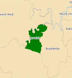Ipswich is a Legislative Assembly of Queensland electoral district on the Brisbane River, west of Brisbane in the Australian state of Queensland. The electorate includes Ipswich and its suburbs, south and east of the Bremer River, west of Bundamba Creek and north of the Cunningham Highway.[1]