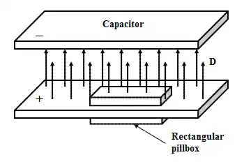 A parallel plate capacitor. Using an imaginary box, it is possible to use Gauss's law to explain the relationship between electric displacement and free charge.