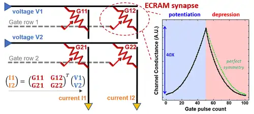 - ^ a b Tang, J. (2018). "ECRAM as Scalable Synaptic Cell for High-Speed, Low-Power Neuromorphic Computing". 2018 IEEE International Electron Devices Meeting (IEDM). pp. 13.1.1–4. doi:10.1109/IEDM.2018.8614551. ISBN 978-1-7281-1987-8. S2CID 58674536.