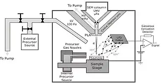 When deposition occurs at a high temperature or involves corrosive gases, a specially designed deposition chamber is used;[3] it is isolated from the microscope, and the beam is introduced into it through a micrometre-sized orifice. The small orifice size maintains differential pressure in the microscope (vacuum) and deposition chamber (no vacuum). Such deposition mode has been used for EBID of diamond.[3][4]