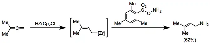 Allylic metal species can be used to prepare allylic amines through electrophilic amination. Although allylic amines are usually prepared through nucleophilic amination of allylic halides, a few examples of electrophlic amination of allylic substrates are known. In the example below, an allylic zirconium reagent (obtained by hydrozirconation) is trapped with an O-alkylhydroxylamine.[26]