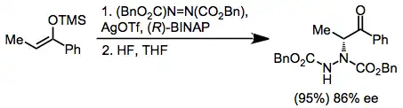 The electrophilic amination of enolates yields α-amino carbonyl compounds. When chiral oxazolidinones are used in conjunction with azo compounds, enantioselectivity is observed (see above). BINAP can also be used for this purpose in the amination of silyl enol ethers.