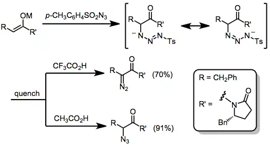 Upon treatment with sulfonyl azides, a variety of Grignard reagents or enolates may be converted into azides or amines.[10] A significant side reaction that occurs under these conditions is the diazo transfer reaction: instead of fragmenting into an azide and sulfinic acid, the intermediate triazene salt may break down to a diazo compound and sulfonamide. Changing workup conditions may favor one product over another. In general, for reactions of enolates substituted with Evans oxazolidinones, trifluoroacetic acid promotes diazo transfer while acetic acid encourages azidation (the reasons for this are unclear).[11] Solvent and the enolate counterion also influence the observed ratio of diazo to azide products.[12]