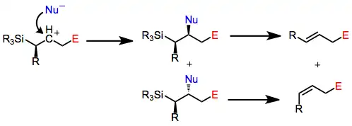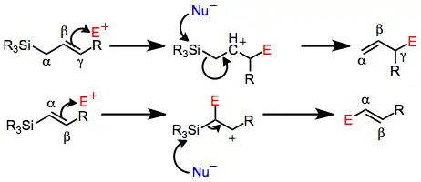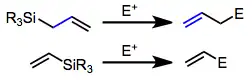 Electrophilic substitution of unsaturated silanes involves attack of an electrophile on an allyl- or vinylsilane. An allyl or vinyl group is incorporated at the electrophilic center after loss of the silyl group.[1]
