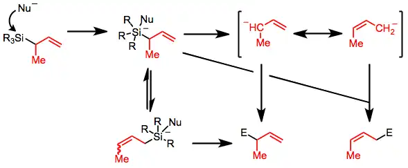 Under conditions of nucleophilic catalysis, any intermediate along the reaction pathway may incorporate a silicon-nucleophile bond. This factor does not affect the outcome unless nucleophilic attack liberates free anions or allylic transposition occurs. The latter is known to occur for hypervalent allylsilanes incorporating fluoride.[8]