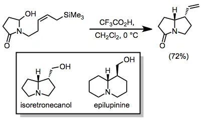 Iminium ions generated in situ may be trapped by intramolecular allysilanes. The cyclization below has been used in syntheses of isoretronecanol and epilupinine.[18]