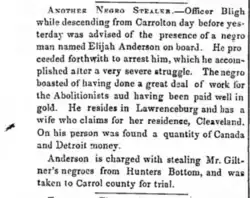 Unfortunately, a letter that Elijah had written to his wife led to him being caught as showed proof that he and a group of other free black abolitionists were working together to free slaves.[1] The strongest testimony against Anderson was that of Wright Ray. Ray was the head of a ring of slave catchers and he testified that he saw Anderson boarding the boat heading for Cincinnati, with the described runaway.[1] Consequently, Anderson was sentenced to eight years and 8 months in prison in the Frankfort, Kentucky penitentiary.[3][12] On June 18, 1857, the Louisville Daily Courirer wrote, "NEGRO STEALER CONVICTED-At the Trimble Circuit Court, held in Bedford yesterday, the case of Elijah Anderson, a free man of color, for running off a slave, was tried, resulting in his conviction and sentence the penitentiary for eight years and eight months. This is a good long term. He had assisted George, slave of Mr. Scott, of Trimble, to run away."[13]