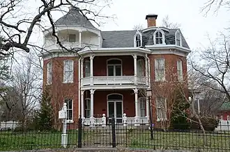The Elliott House is a historic house at 303 South Third Street in Bentonville, Arkansas. It is a large three-story brick house with Italianate style, built in 1887 for Harry Elliott, who made a fortune investing in silver mines in Silver City, New Mexico. The house is distinctive for its use of brick on the interior as well as exterior walls; those on the inside are 8 inches (20 cm) thick, those outside are 16 inches (41 cm). The exterior features include seven porches, a widow's walk, and carved brackets in deeply overhanging eaves.[2]