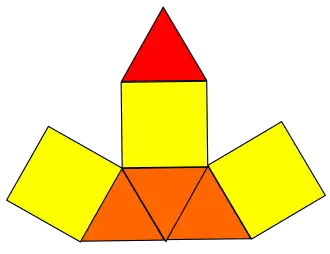 The elongated triangular pyramid is constructed from a triangular prism by attaching regular tetrahedron onto one of its bases, a process known as elongation.[2] The tetrahedron covers an equilateral triangle, replacing it with three other equilateral triangles, so that the resulting polyhedron has four equilateral triangles and three squares as its faces.[3] A convex polyhedron in which all of the faces are regular polygons is called the Johnson solid, and the elongated triangular pyramid is among them, enumerated as the seventh Johnson solid .[4]