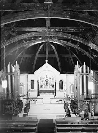 The interior is rectangular in plan with a center aisle. The semicircular apse at the south end of the building is partially cut off from the nave by banks of organ pipes at either side. A narrow rectangular open narthex at the north end with a small enclosed winder stair on the west wall leads to the balcony. The narthex is 10' x 44'8"; the nave is 60'6" x 44'8"; and the apse has a 22'4" radius.[6]