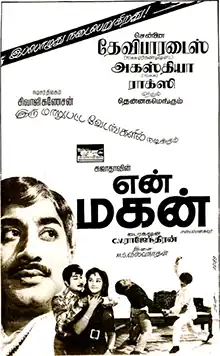 En Magan (transl. My Son) is a 1974 Indian Tamil-language action drama film directed by C. V. Rajendran.[1] The film stars Sivaji Ganesan and Manjula, with K. Balaji, Major Sundarrajan, R. S. Manohar, V. S. Raghavan, V. K. Ramasamy and Manorama in supporting roles.[2] It is a remake of the 1972 Hindi film Be-Imaan.[3] The film was released on 21 August 1974, and became commercially successful.