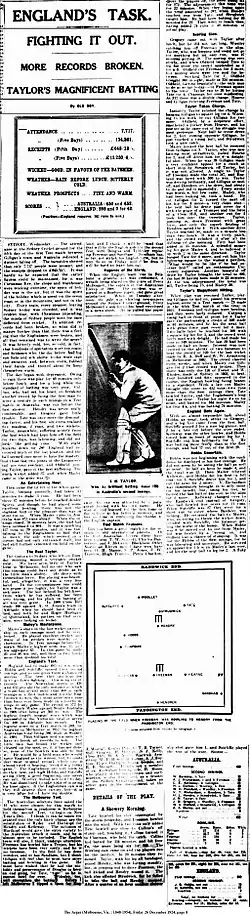 The first Test included a record 127 run tenth wicket partnership between Johnny Taylor and Arthur Mailey which stood as Australia's best for that wicket until Phillip Hughes and Ashton Agar set a new world record by scoring 163 for the tenth wicket against England in the First Test at Trent Bridge in July 2013.
